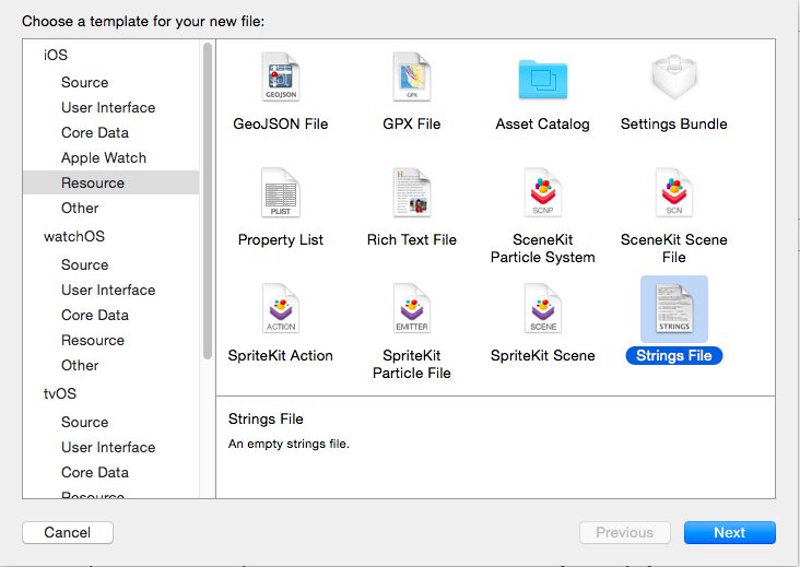 Resource の Strings File を選択して、Next で、InfoPlist を作成