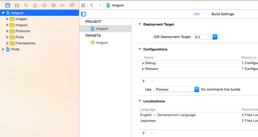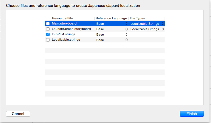 Info タブの、Localizations の + をクリックして、Japanese を選択