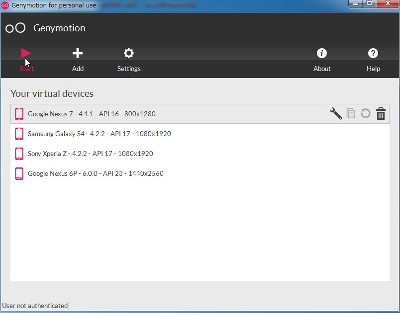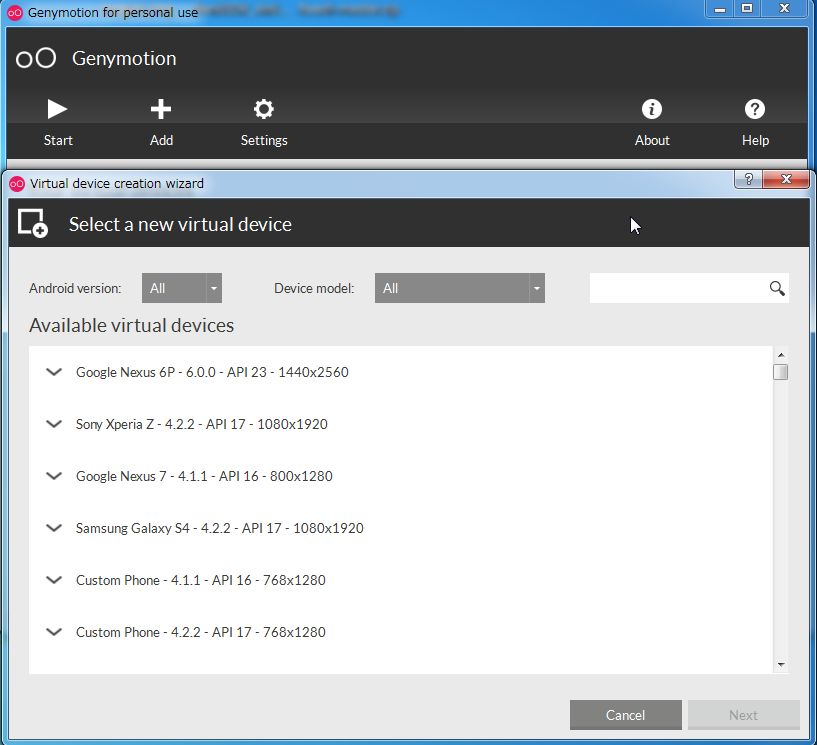 12. 続いて、Genymotion のデバイスイメージをダウンロードして起動します。