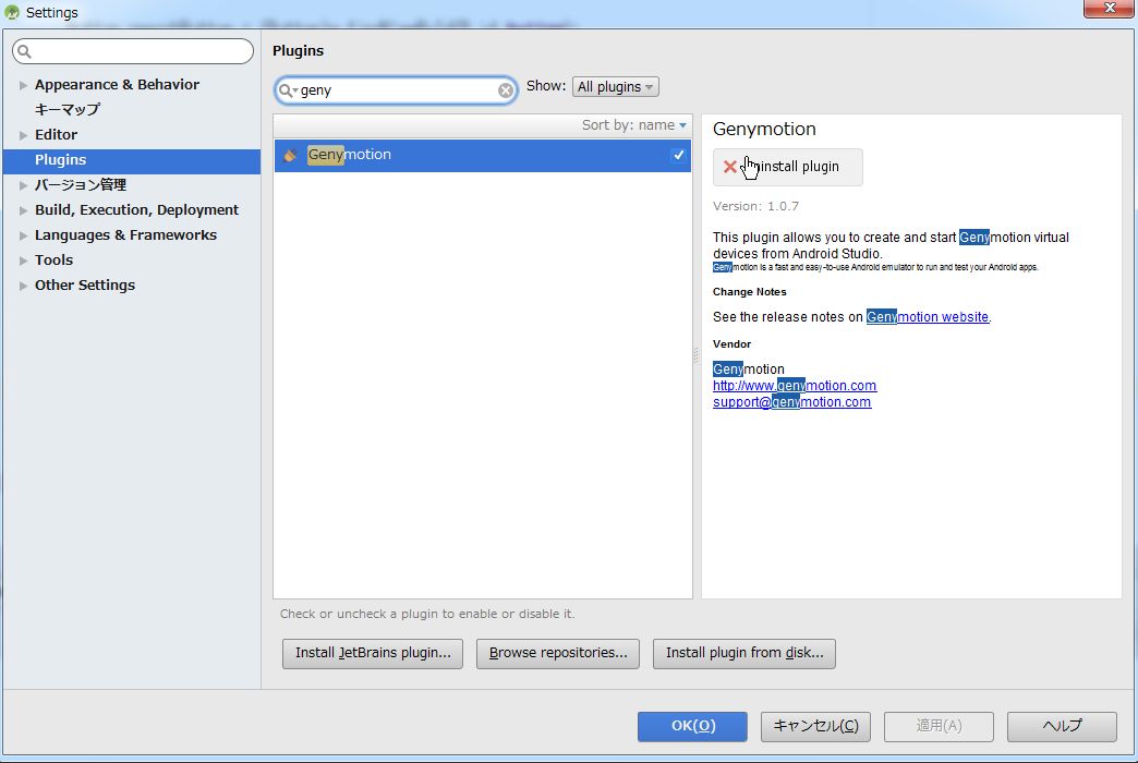 検索結果の Genymotion をクリックして、install plugin をクリックしてプラグインをインストールします。