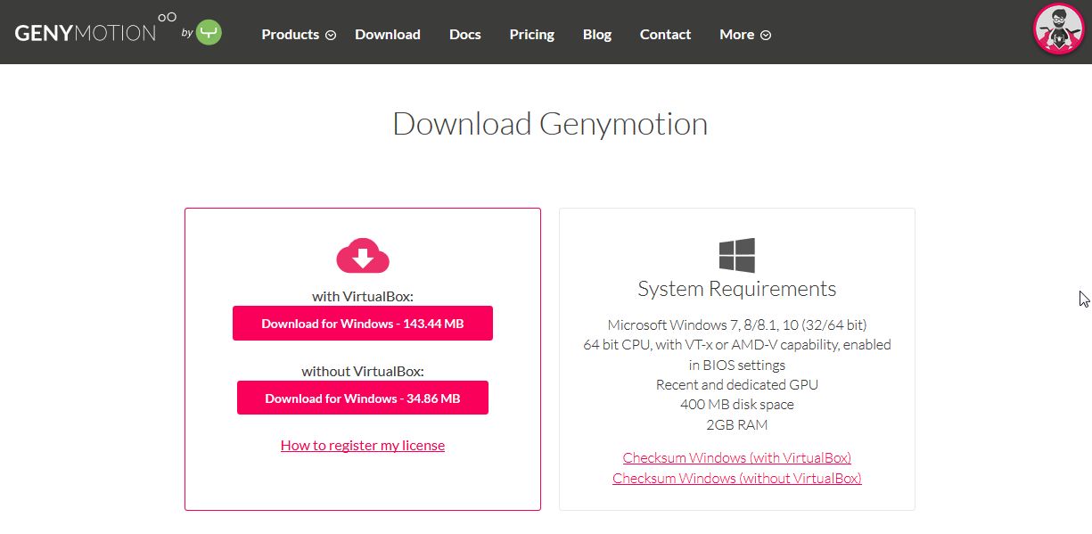 5. 次に、Genymotion に登録して、ソフトをダウンロードします。