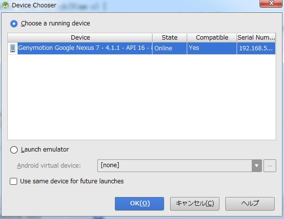以下のようなデバイス起動画面が出るはずですので、起動したエミュレータを選択して、Start をクリックします。