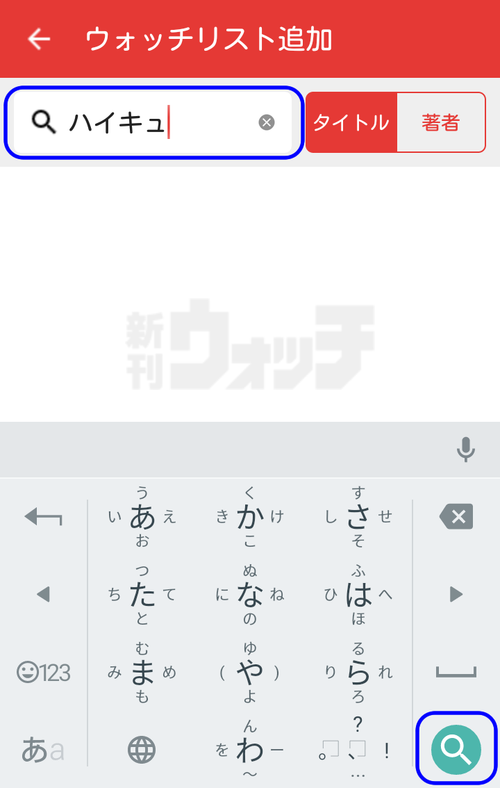 次に、追加したいコミックのタイトルを入力して、キーボード検索ボタンをタップします。