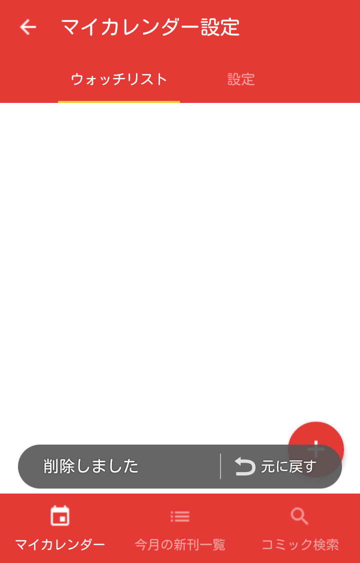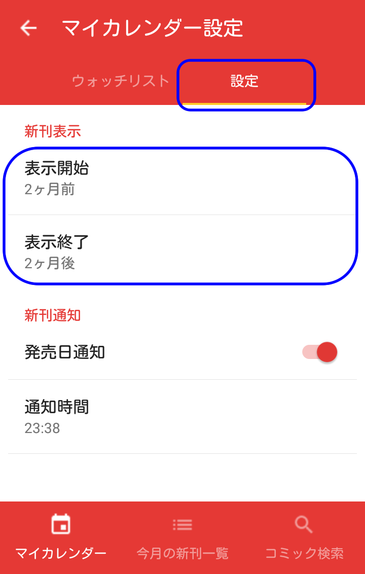 ちなみに、マイカレンダー設定の「設定」タブの「新刊表示」で、ウォッチリストに登録されたタイトル・著者の新刊コミックを前後何ヶ月分表示するのか設定できます。
