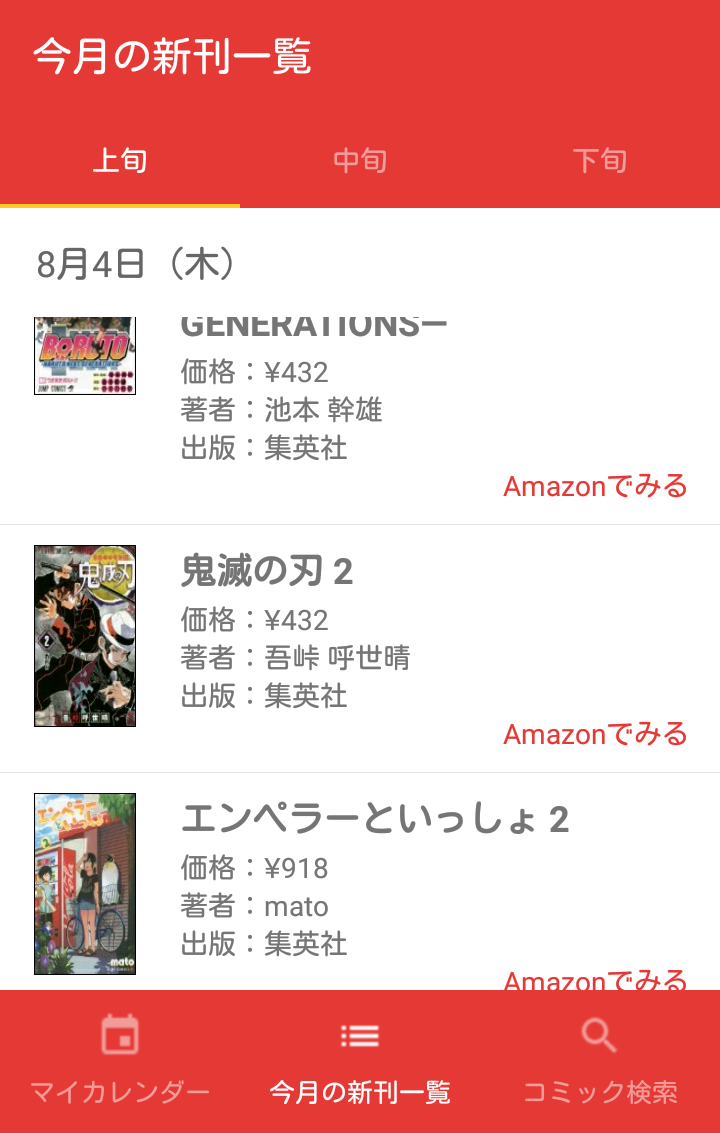 今月発売のコミック新刊一覧を上中下旬の3つに分けて見ることができます。